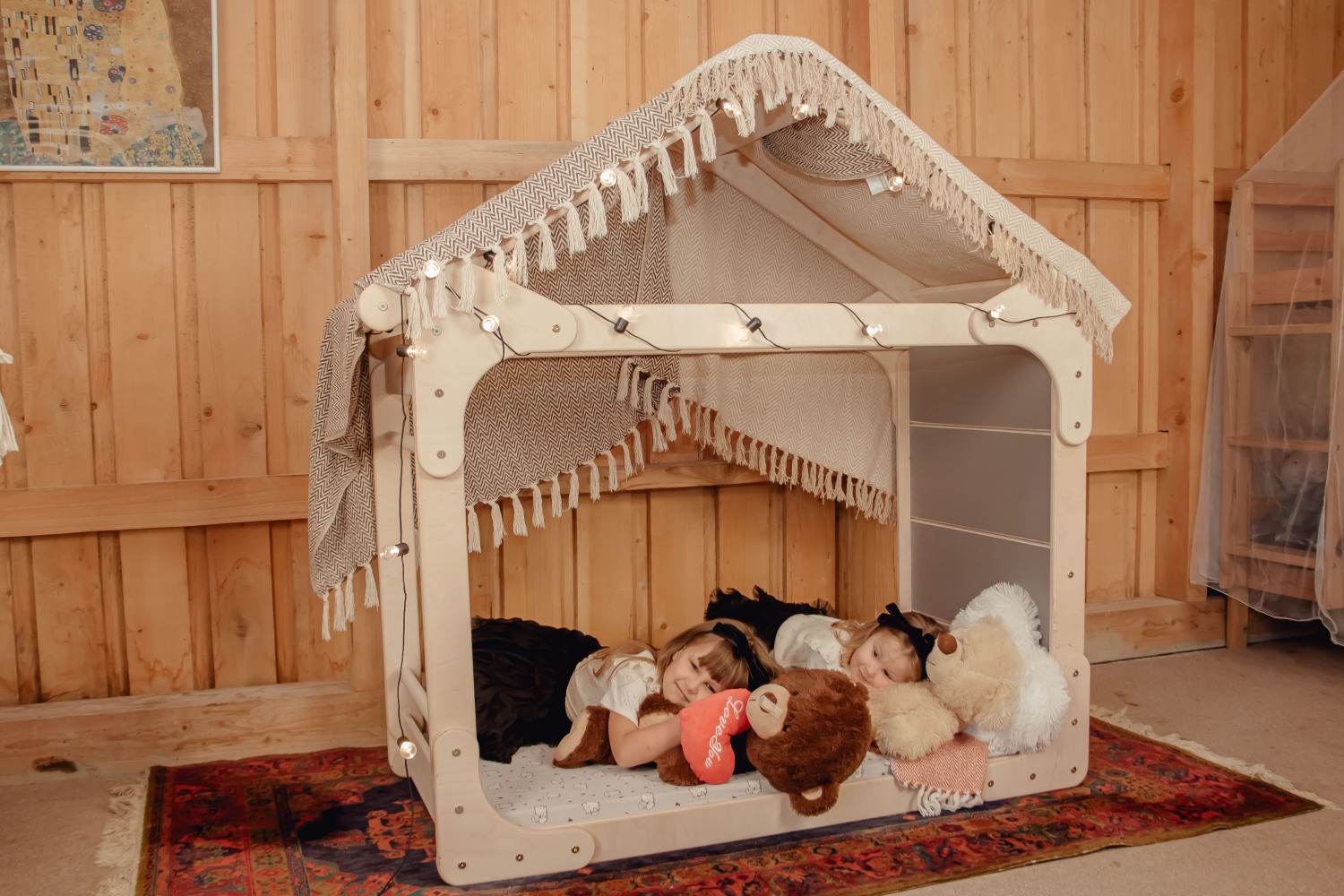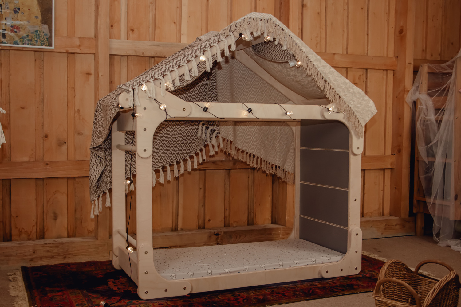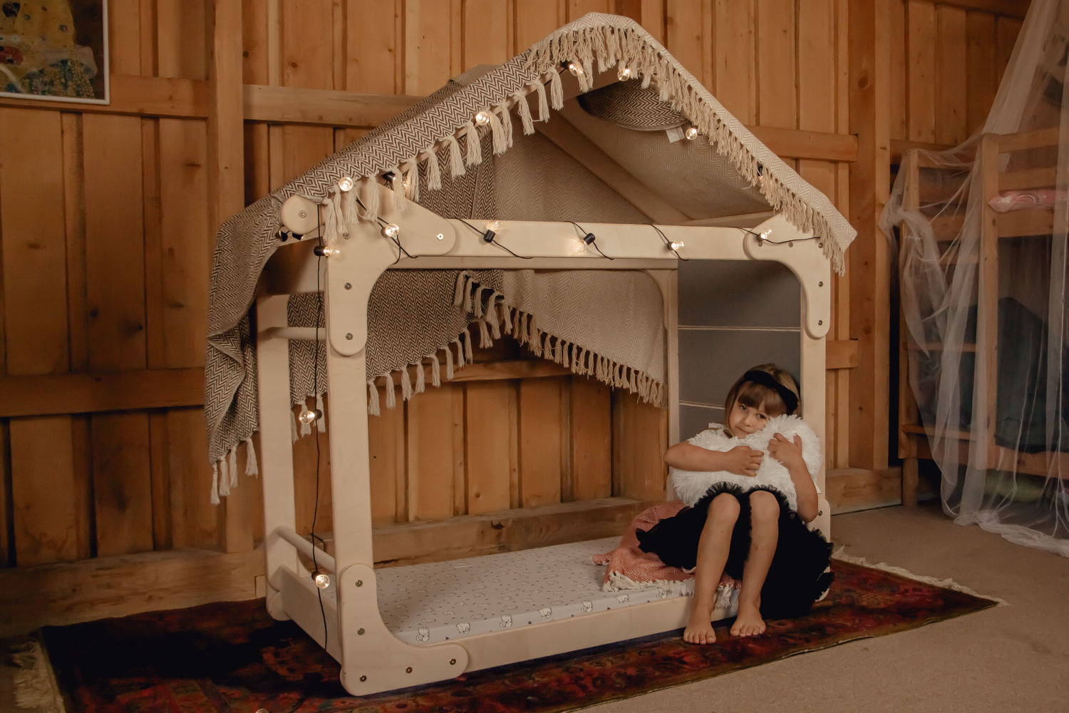 A warm and secure wooden house bed with one closed side — creating a perfect nook for rest, play, and imagination. Made from natural birch plywood with no varnish or paint.